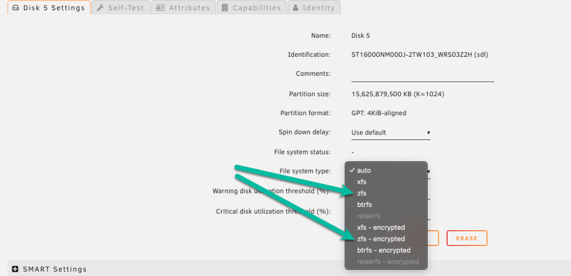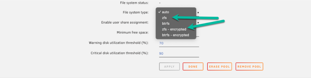 2. Stellen Sie den Dateisystemtyp auf zfs oder zfs-verschlüsselt (für LUKS-Verschlüsselung) ein.