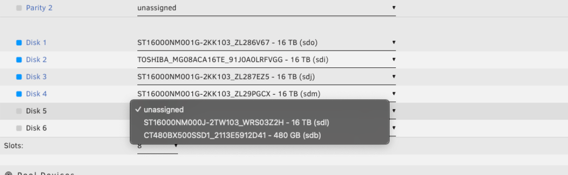 Wenn Sie einen ZFS-Pool in Unraid importieren, müssen Sie alle Laufwerke Ihres ursprünglichen Pools, einschließlich derer, die für Unterstützungs-vdevs verwendet wurden, den Pool-Slots zuweisen. Unraid erkennt die Rolle jedes Laufwerks automatisch (Daten, Log, Cache, Special oder Dedup), sobald das array gestartet ist. Sie müssen nicht selbst festlegen, welches Laufwerk welchen Zweck hat.